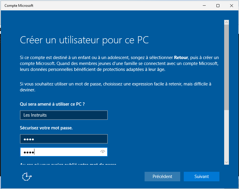 Tu verras alors une fenêtre s’ouvrir qui t’inviteras à créer un utilisateur local pour ce PC :