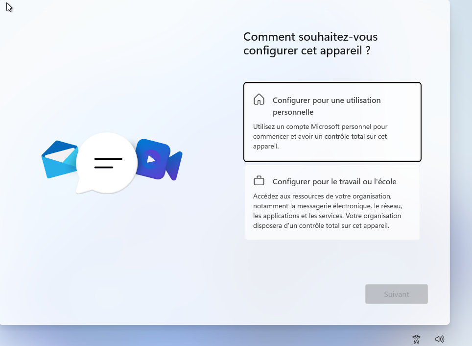 Une fois Windows fraîchement installé, tu va te retrouver devant ce fameux écran de “Bienvenue” qui te demandera, entre autres, de configurer ton clavier, d’activer la reconnaissance vocale personnalisée, etc.
